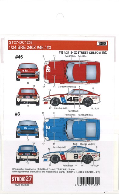 STUDIO27 デカール T社 1/24対応 BRE ダットサン 240Z #46 or #3
